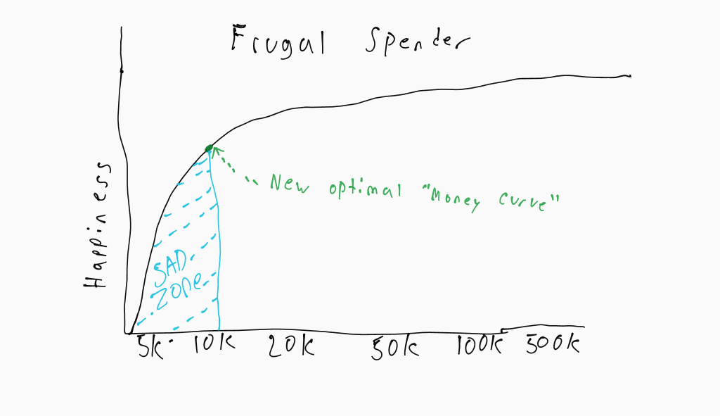 You see that’s the key – everyone wants to live like an Average Joe level of happiness, but few make enough money to live it. You need to make double the amount of money of the spending level you are optimally happy. This allows you happiness now, happiness later, and potential exponential happiness later with compounding interest.